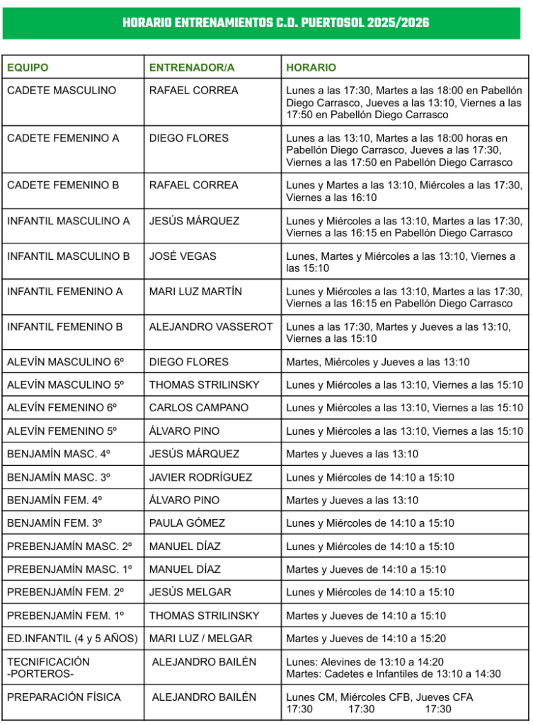 HORARIO ENTRENAMIENTOS C.D. PUERTOSOL 2025/2026