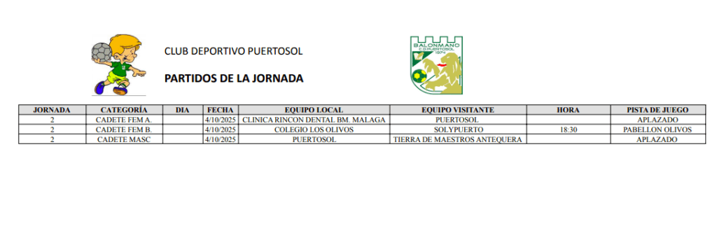 De los equipos cadetes que comenzaron la liga la semana pasada, solo jugará este fin de semana el Cadete Femenino SolyPuerto de Rafael Correa, que disputará su partido el viernes en el Pabellón de Los Olivos.