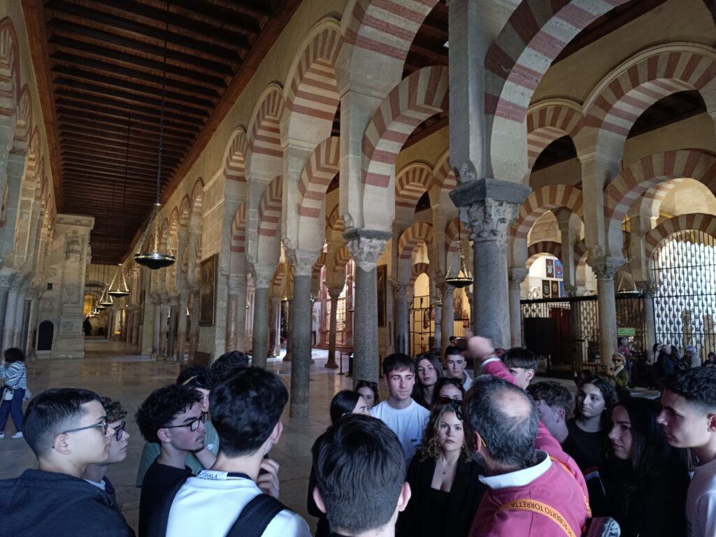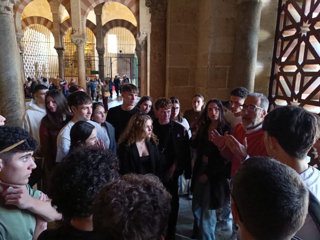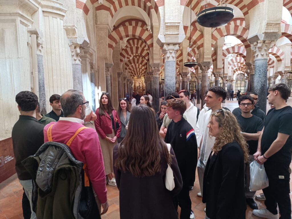 La visita continuó por la tarde en la emblemática Mezquita-Catedral de Córdoba, uno de los monumentos más representativos del patrimonio histórico español. A lo largo del recorrido, los alumnos pudieron apreciar la singular fusión de elementos arquitectónicos islámicos y cristianos que caracterizan este edificio, considerado un símbolo de la riqueza cultural e histórica de la ciudad.