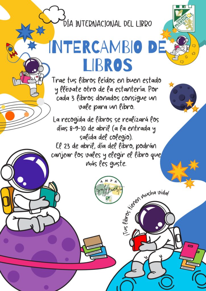 Con motivo del Día Internacional del Libro, el AMPA de nuestro colegio vuelve a poner en marcha su iniciativa de intercambio de libros, una actividad que ya realizaron el pasado curso y que tuvo muy buena acogida entre las familias. Durante los días 8, 9 y 10 de abril, se recogerán libros leídos y en buen estado y, el próximo 23 de abril, los alumnos podrán canjear sus vales y elegir nuevas lecturas para disfrutar. Una propuesta sencilla y especial que fomenta la lectura, el intercambio y una segunda vida para los libros.